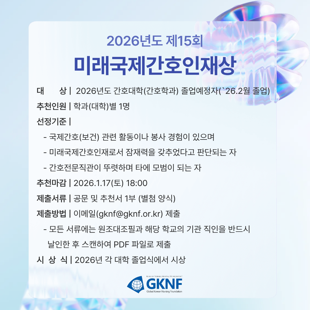 [국제한인간호재단] 2026년 제15회 미래국제간호인재상 수상자 신청 안내